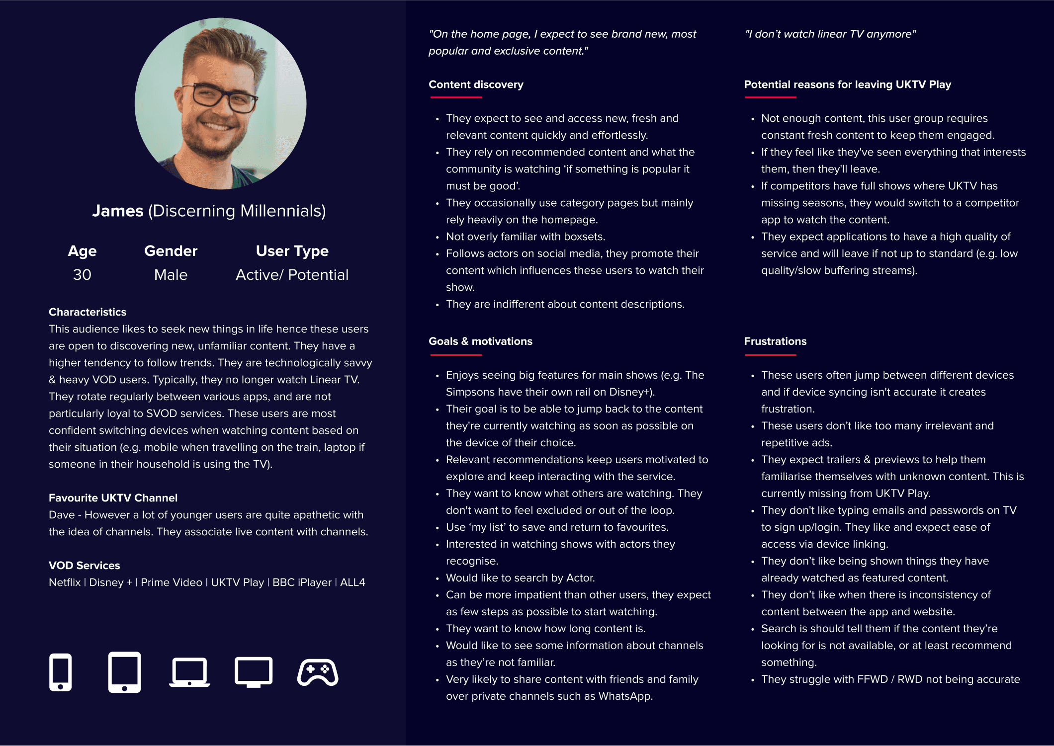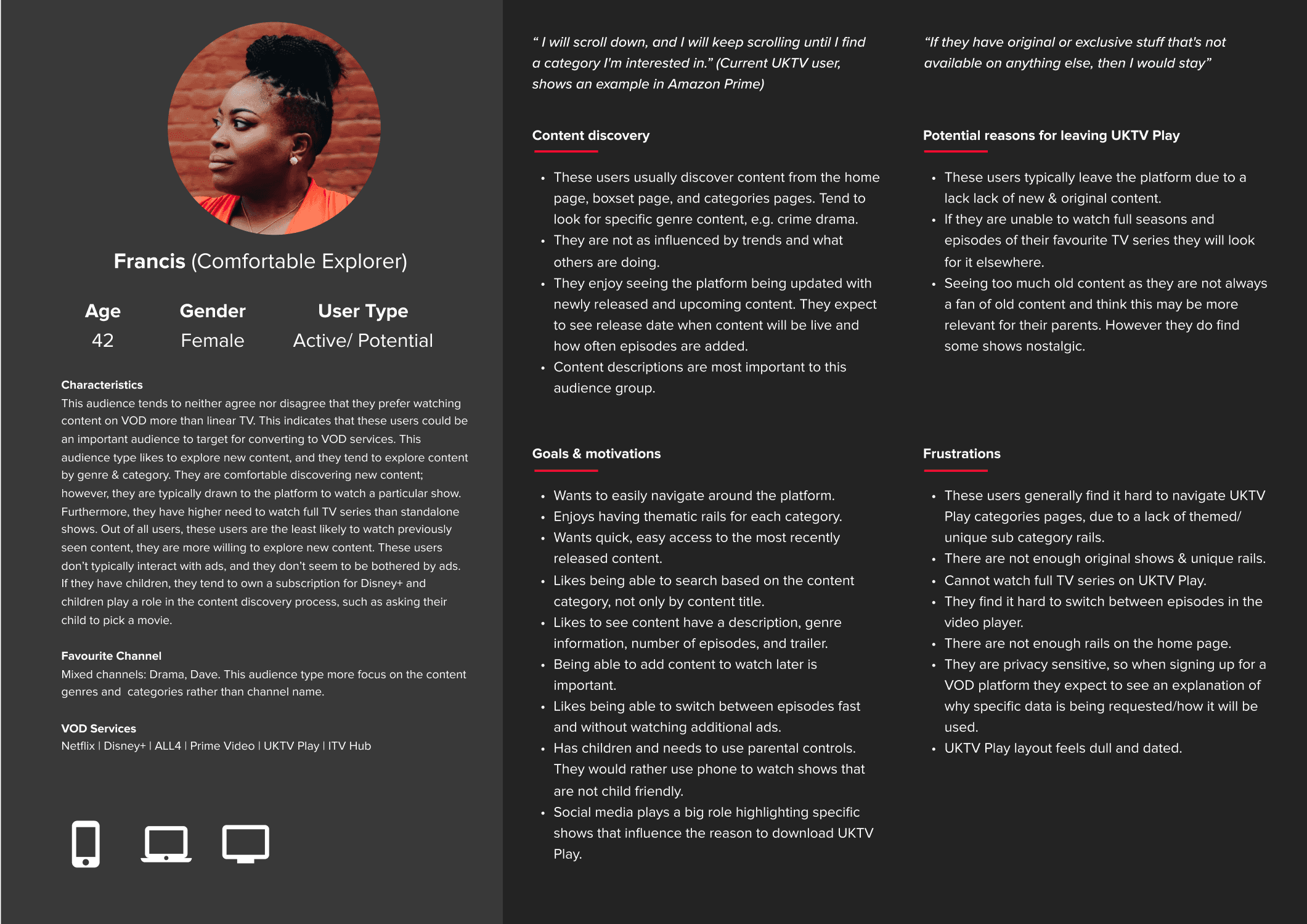 We identified three key audience groups, each with unique viewing habits and needs. These insights helped shape a design that caters to diverse user expectations.